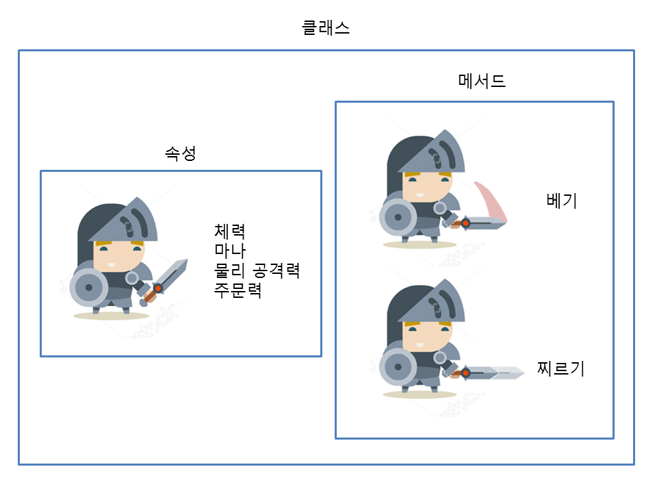 이 클래스는 크게 두가지로 구성된다. 앞서 이야기했던 속성과 메소드이다. 아주 좋은 예시가 있어서 가져왔다. 우리의 클래스가 어떤 캐릭터를 만들어내는 클래스라면, 해당 클래스로 만들어진 캐릭터 인스턴스에는 즉 캐릭터에는 체력도 있어야하고 마나도 있어야할 것이며, 칼로 베기, 칼로 찌르기 등의 행위도 할 수 있어야 한다. 이를 위해서 설계할 때 이러한 속성과 메소드를 가진 객체로 태어날 수 있도록 설정해주는 것이다.